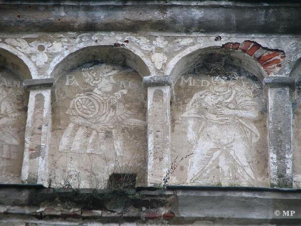nezreštaurovaná sgrafotová výzdoba s figurálnym ornamentom |